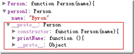 Person的实例person1中包含了name属性,同时自动生成一个__proto__属性,该属性指向Person的prototype,可以访问到prototype内定义的printName方法,大概就是这个样子的