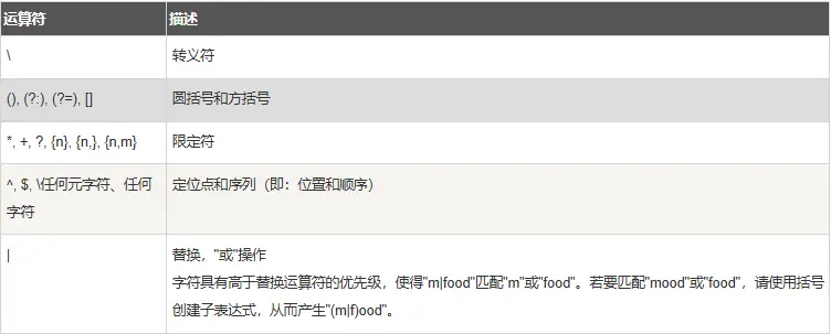 正则表达式从左到右进行计算,并遵循优先级顺序,这与算术表达式非常类似。 相同优先级的从左到右进行运算,不同优先级的运算先高后低。下表从最高到最低说明了各种正则表达式运算符的优先级顺序: